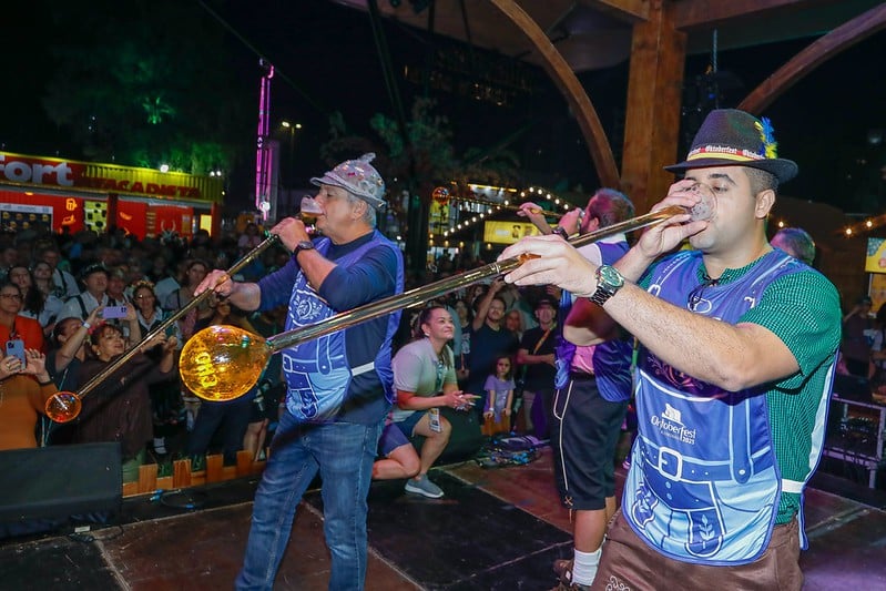 Todos os dias, às 20h, um grande público se reúne ao redor do palco do Boulevard Spaten Garden para assistir a uma das atrações mais típicas da 40ª Oktoberfest Blumenau: a prova do chope em metro. A diversão está em zerar uma tulipa com 600ml de chope sem álcool no menor tempo possível, sem derramar ou tirar da boca.